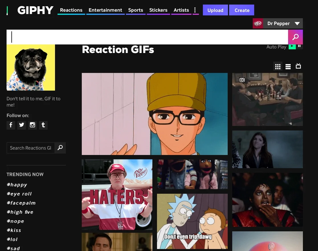 We also created a bank of Larry reaction GIFs to be used in Dr Pepper Twitter moderation and on GIPHY. Some of our GIFs had over 14M views and made it onto GIPHY's "top reaction GIFs of the day" page.