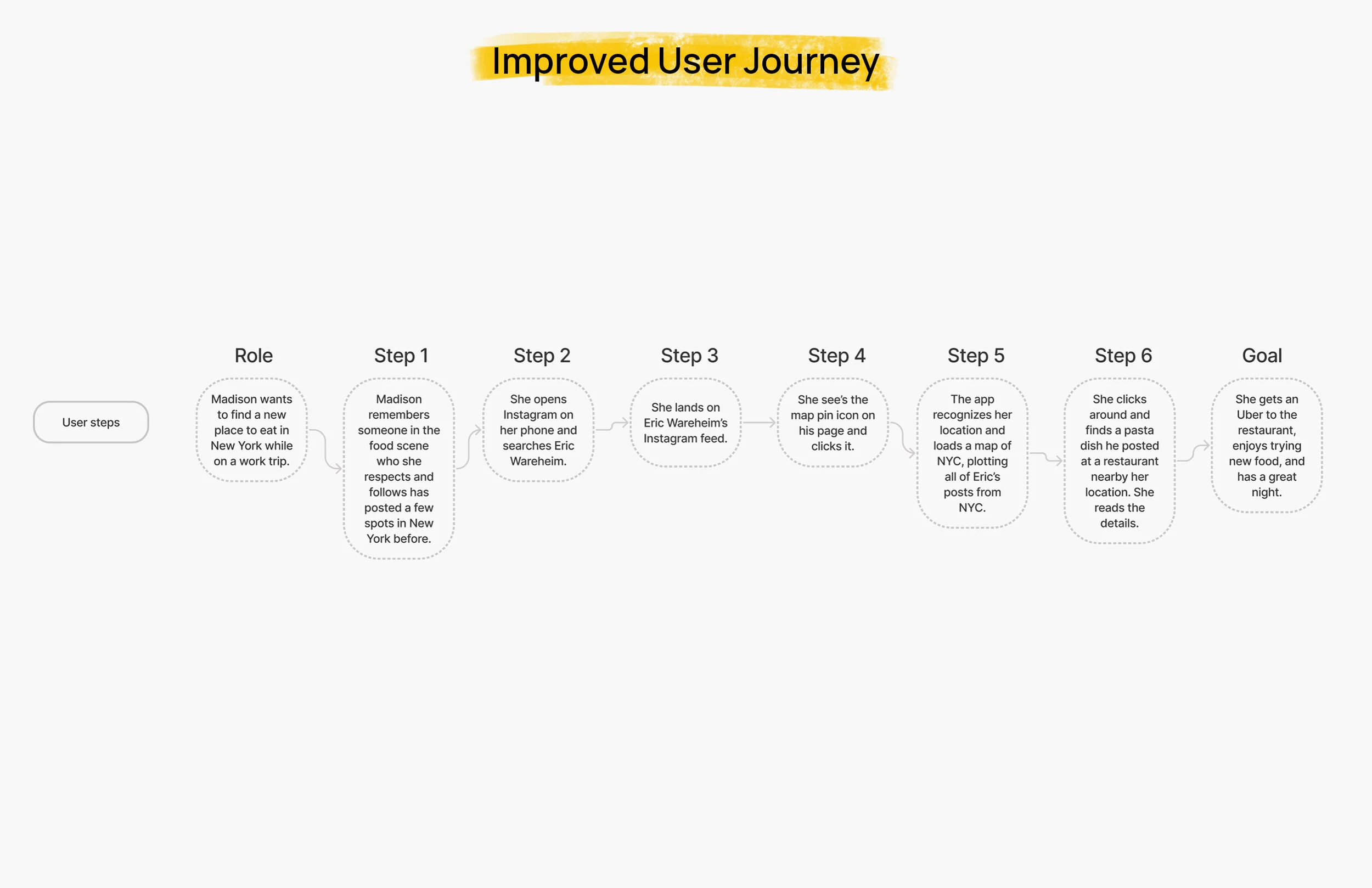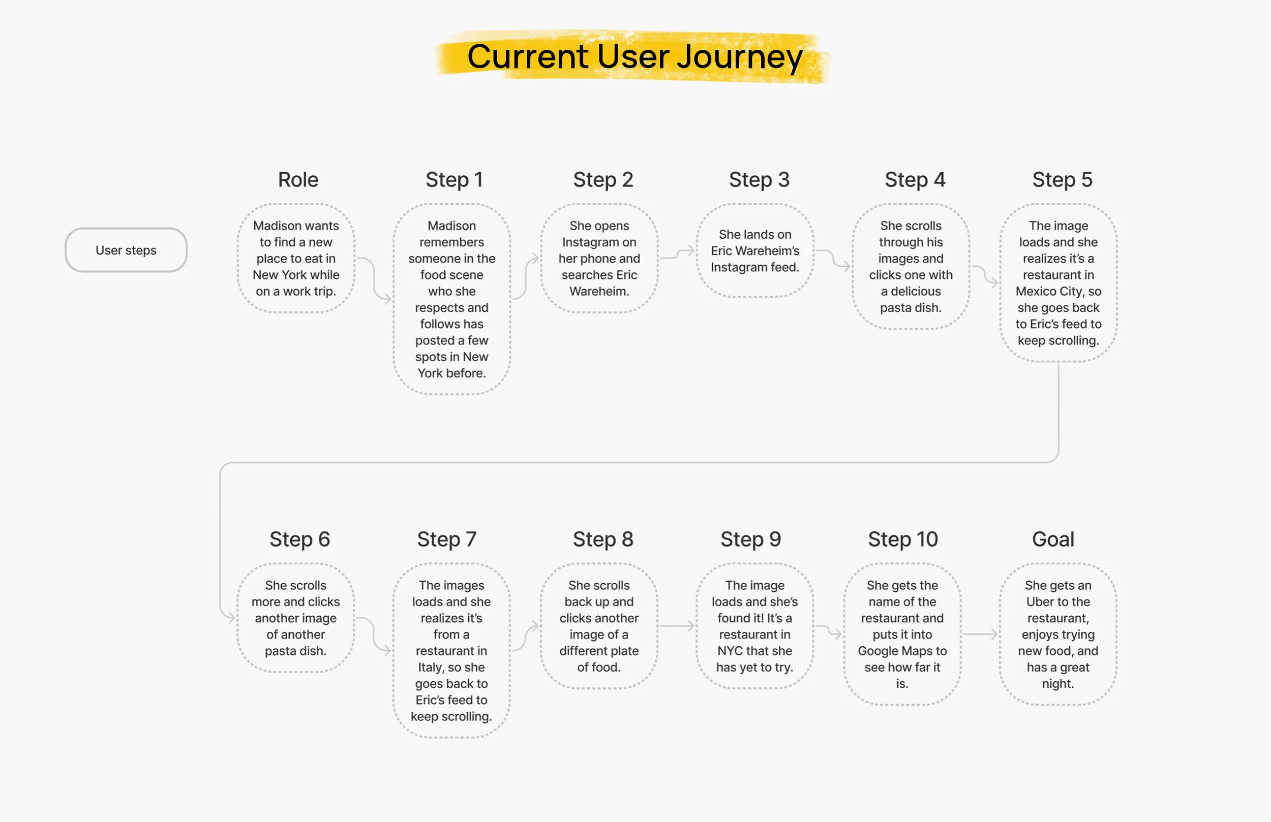 I began by focusing on “the who” – in addition to myself, who else would find this feature useful? I started by brainstorming a bunch of different Instagram personas who I felt would benefit from a feature like this. Knowing that there were many types of users gave me the confidence that a feature like this would be worth pursuing. But for the purposes of this project, I decided to narrow and focus on one persona, “the food lover”, which is me.